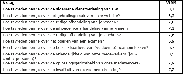 In november 2025 is aan de WRM-opleiders een enquête gestuurd over de tevredenheid van opleiders over de dienstverlening van IBKI. Van de 77 verstuurde vragenlijsten hebben 16 opleiders gereageerd. Dat is 20,8%. Hieronder de weergave van de vragen en de waardering per vraag.